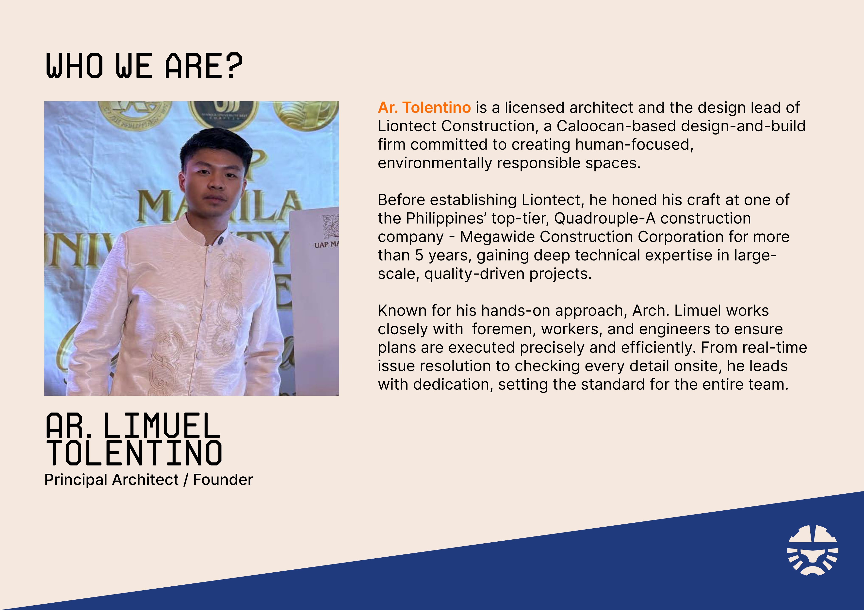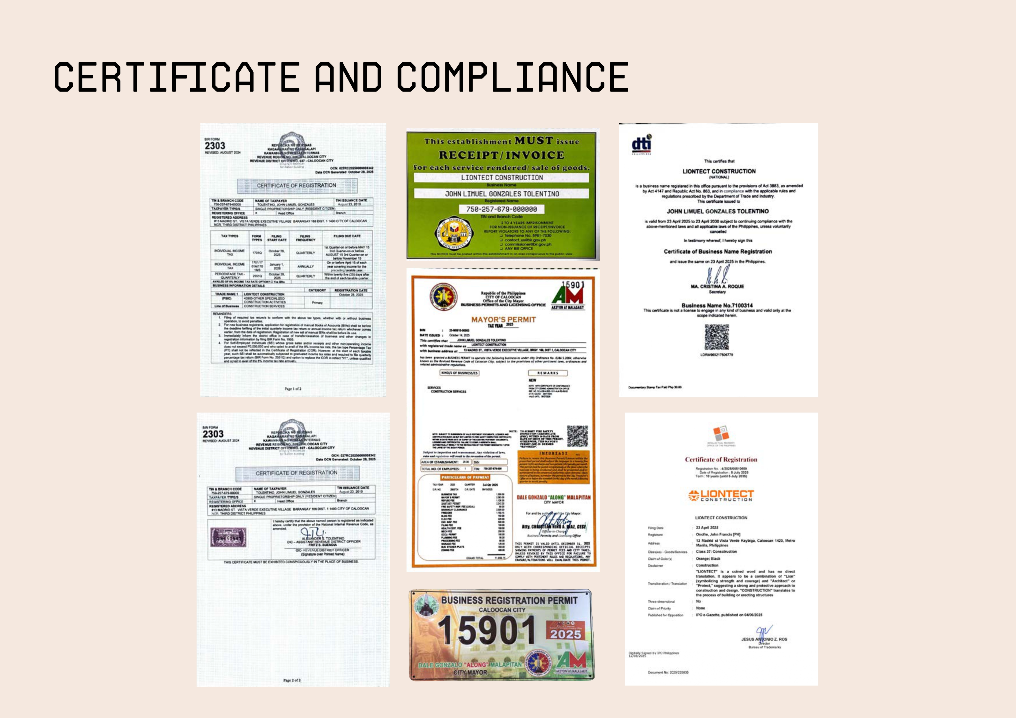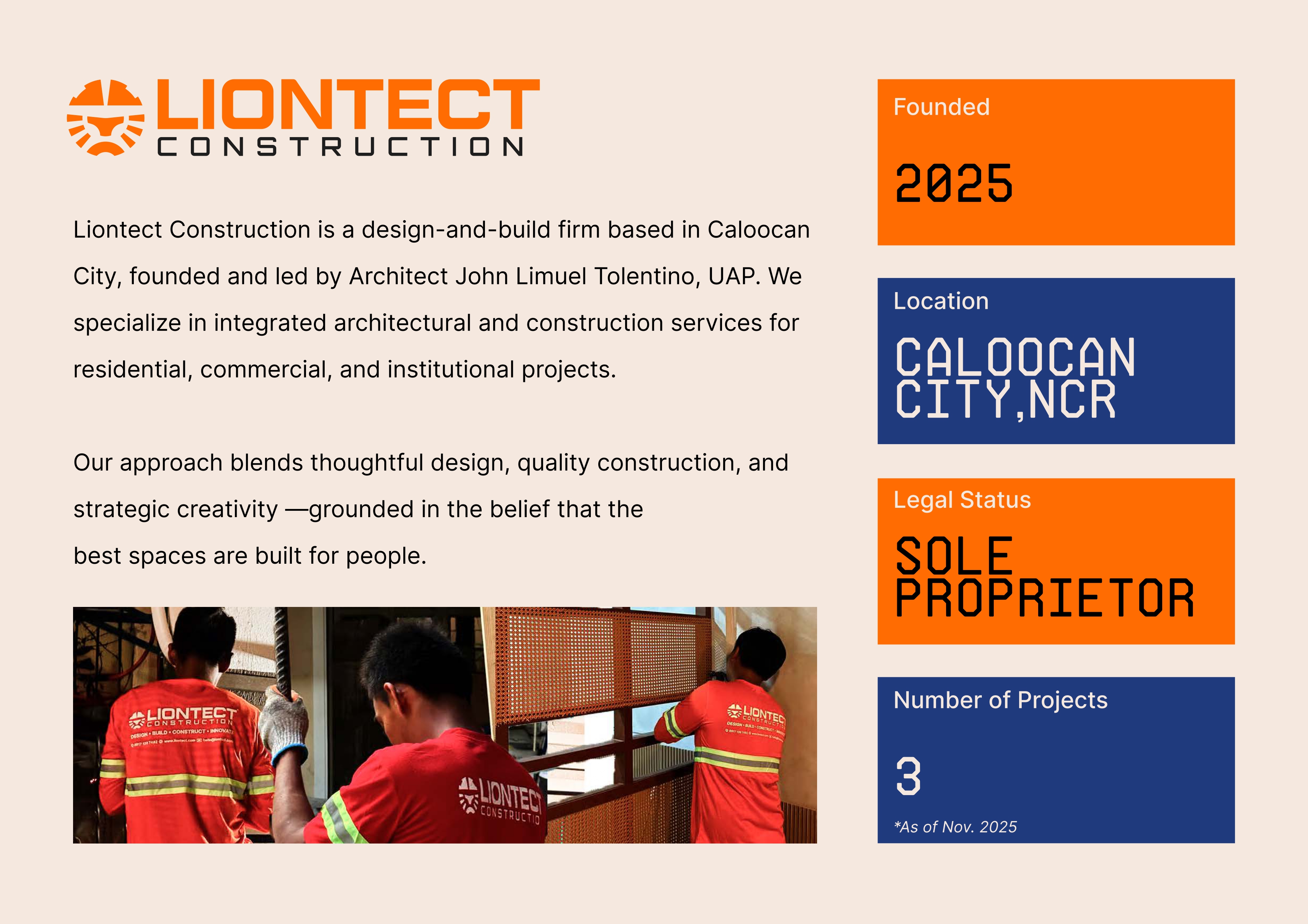 Liontect Construction® is a registered trademark under Architect Limuel Tolentino, licensed by the PRC. All services are rendered in compliance with Philippine laws, including the National Building Code. All designs are protected and may not be reproduced without permission.